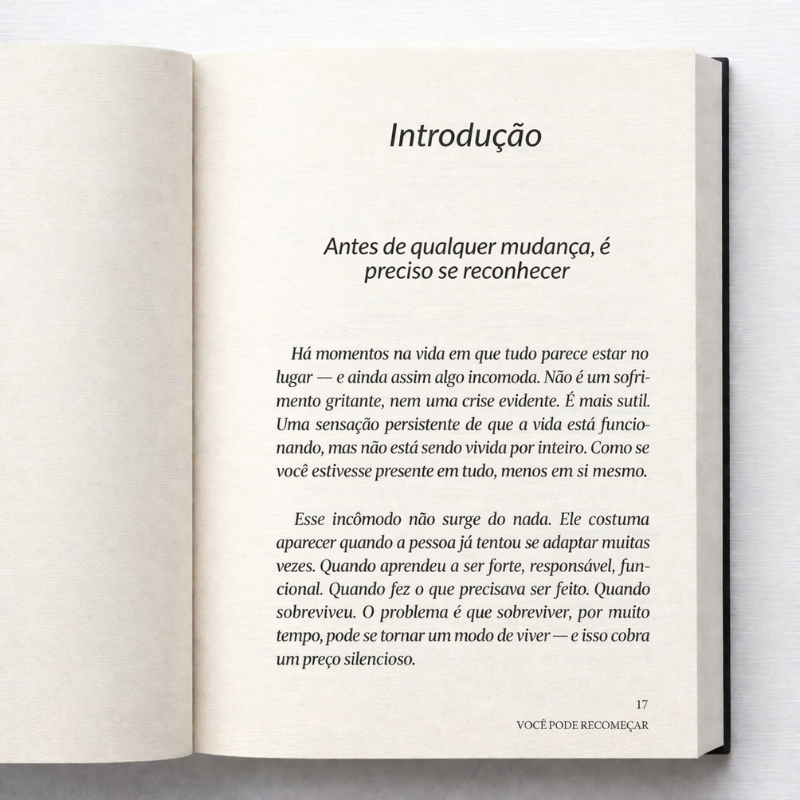 Este não é um livro para quem busca mudanças rápidas. É para quem sente que repetir já não basta. Para quem percebe que continuar vivendo no automático cobra um preço silencioso. Para quem entende que recomeçar não significa esquecer o que foi vivido, mas deixar de ser governado por isso.